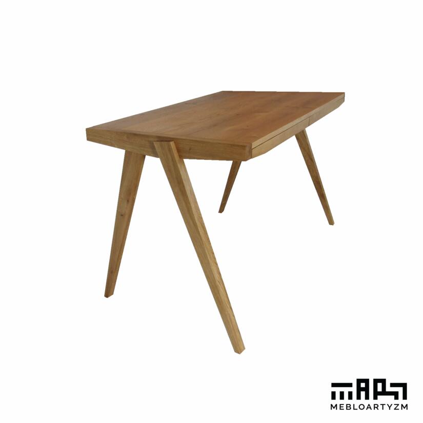 To biurko jest ciekawą propozycją dla osób oczekujących produktu wykonanego z masywnego drewna w połączeniu z delikatną sylwetką. Smukłe kształty tego biurka pozwolą urządzić wnętrze do pracy w sposób lekki i nowoczesny. Blat wykonany w kształcie trapezu powoduje, że design jest niepowtarzalny. Dodatkowo nogi, które połączyliśmy z oskrzynią z dwóch stron powodują, że biurko z każdej strony wygląda inaczej. Ten mebel nigdy się nie znudzi.